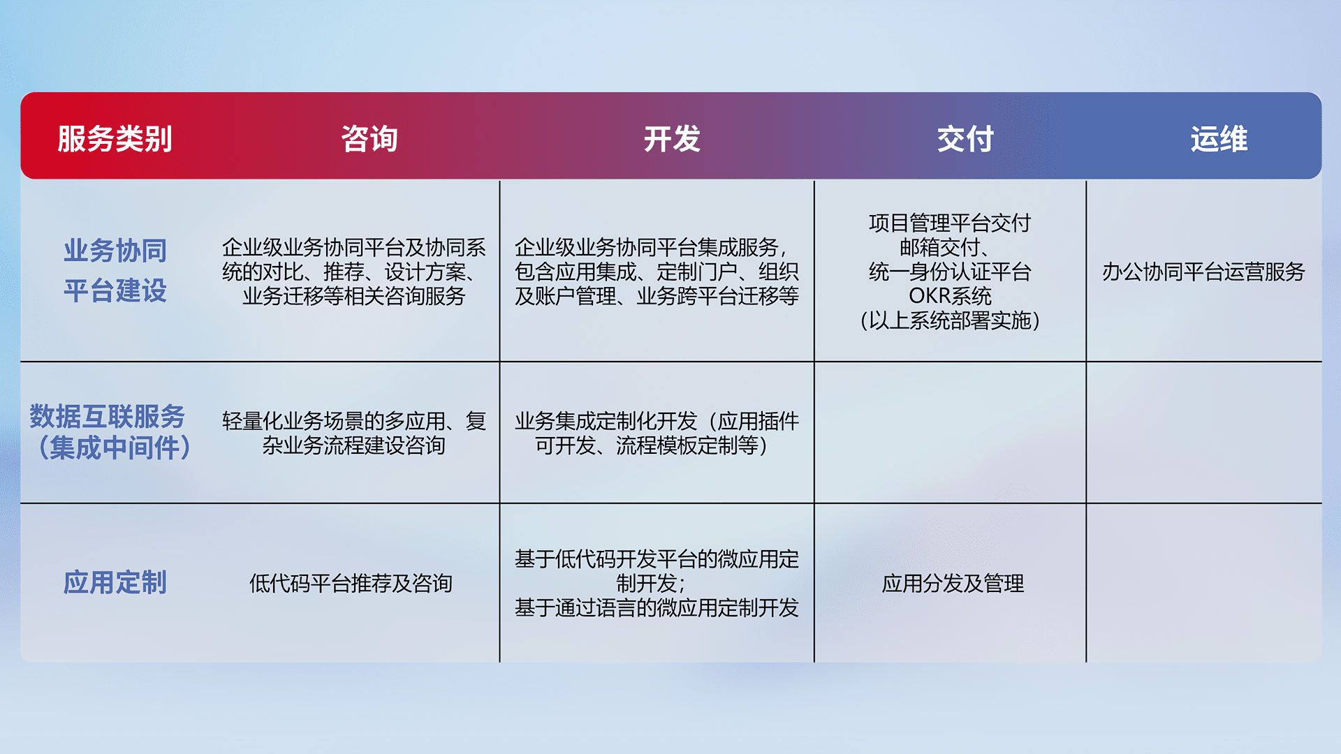 针对钉钉、、、、企微、、、IDaas等平台级产品提供产品的规划、、方案、、、交付、、定制化开发等服务,,实现如统一协同办公、、、、智能客户服务、、、、混合会议管理、、、智能数据查询、、、、等业务场景,,,,实现数字化转型。。。。